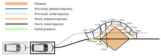 If we assume that each expanded primitive shares a fixed arc length and that the position of the k-th primitive starting from the starting point is then the point on the collision-free trajectory from the previous cycle, closest to the starting point of the current cycle, can be found. Then, we iteratively check if line is collision-free and if , where is the threshold parameter. If either of the above requirements is not satisfied, the newly searched primitive will not be accessed anymore. The topology-guided hybrid A* search process for urban scenarios is illustrated in Figure 4: