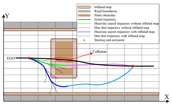 In addition to the requirement for the trajectory to satisfy homotopy, the distance between the obstacles on either side of the expanded node should exceed the vehicle’s width. Otherwise, even if a driving corridor can be generated, the vehicle cannot pass through safely. The solution is implemented using an inflated map, where obstacles and road boundaries are expanded by a predefined threshold value, denoted as , where w represents the width of the ego vehicle and is the parameter to increase the safety margin. As long as the hybrid A* algorithm can find a trajectory to the end point, the vehicle can pass through. As illustrated in Figure 5, before map inflation, the green line represents a trajectory that should be excluded from the search but is mistakenly included. After map inflation, the desired trajectory indicated by the blue line is successfully identified.
