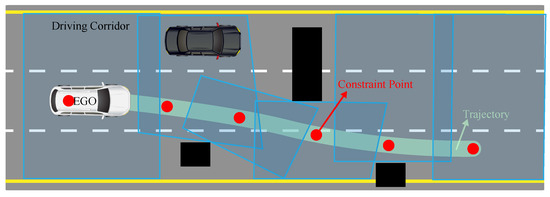 where is the number of hyperplanes, and and represent the parameters describing a hyperplane. Due to the convexity of the driving corridor, the sufficient and necessary condition to ensure that the vehicle’s outline remains within the driving corridor is that the vertices of the vehicle’s outline are within the driving corridor. The generation of driving corridors in complex urban scenarios is illustrated in Figure 6.