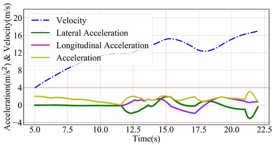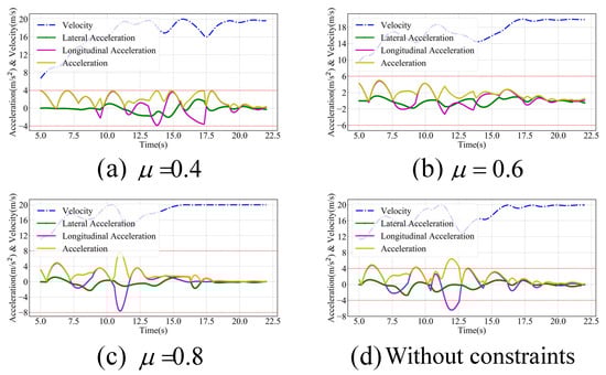 Figure 7 depicts the velocity, the longitudinal and lateral accelerations, and the total acceleration of the planned trajectory between 5 s and 22 s. The decision-making process and the planned trajectories varied under different road surface adhesion coefficients. As the longitudinal acceleration increased, the lateral acceleration decreased to meet the constraints imposed by the friction circle, suggesting that the vehicle might be in the acceleration phase. Conversely, a reduction in longitudinal acceleration associated with increased lateral acceleration might indicate a lane-changing phase. Throughout, the total acceleration of the planned trajectory did not exceed the limits of the friction circle.