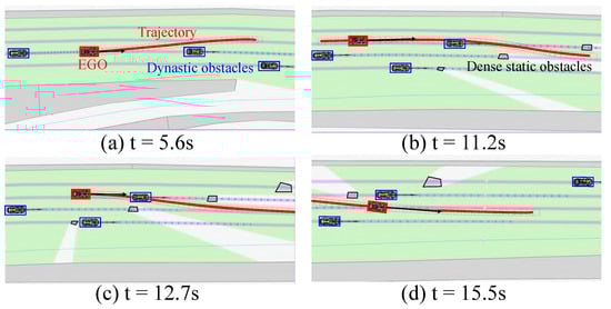 The planned results for the road surface adhesion coefficient of 0.8 are illustrated in Figure 8. At t = 5.6 s, an overtaking trajectory was planned. At t = 11.2 s, the vehicle planned to change lanes to the right, but, due to a vehicle ahead, it decelerated to maintain a safe distance from the preceding vehicle. At t = 12.7 s, the acceleration trajectory was re-planned while ensuring no collision with static obstacles on both sides. At t = 15.5 s, the vehicle had successfully navigated through the complex section and subsequently maintained a straight trajectory at approximately 20 m/s. Throughout the process, the planned trajectory consistently ensured safety. It is important to note that we focused on the physical properties of the ego vehicle while ignoring those of other intelligent agents in the simulation.