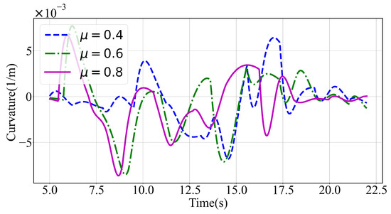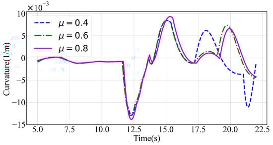 Trajectory curvature is one of the key indicators of trajectory smoothness, particularly in high-speed driving scenarios. Figure 9 shows that under different road surface adhesion coefficient conditions, the planned trajectory curvature showed slight differences and generally maintained a low value, indicating good trajectory smoothness.
