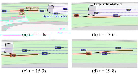 The planned results for a road surface adhesion coefficient of 0.8 are illustrated in Figure 11. At t = 11.4 s, the autonomous vehicle approached large obstacles and dynamic obstacles ahead. At t = 13.6 s, the vehicle followed a decelerating and obstacle-free trajectory. At t = 15.3 s, the vehicle almost passed static obstacles without collision. At t = 19.8 s, a leftward accelerating trajectory was planned, to overtake. The vehicle remained safe throughout the process.