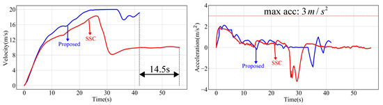 A comparative experiment with the SSC planner [35] was conducted in a scenario where the ego vehicle accessed an urban expressway and arrived at a predetermined position. As illustrated in Figure 13, this scenario encompassed a range of vehicles along a stretch of approximately 480 m. The maximum longitudinal acceleration was set at 3 m/s2, the weight was set to 10, and the maximum velocity was set 20 m/s. To ensure fairness, the same behavior planner was employed as in the experiment in [35].