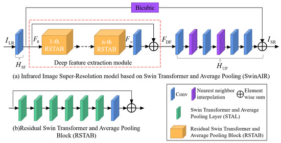 Structure of our proposed Infrared Image Super-Resolution model based on Swin Transformer and Average Pooling, SwinAIR. Firstly, the input LR infrared undergoes the shallow feature extraction module to extract the shallow feature map ; then, is deep extracted and refined by the deep feature extraction module. We obtain after RSTABs. After undergoes convolutional operations, it is further combined with through residual connection to obtain the deep feature map . Finally, is input into the upsampling module to generate the output SR infrared image . The interpolation operation here is bicubic.