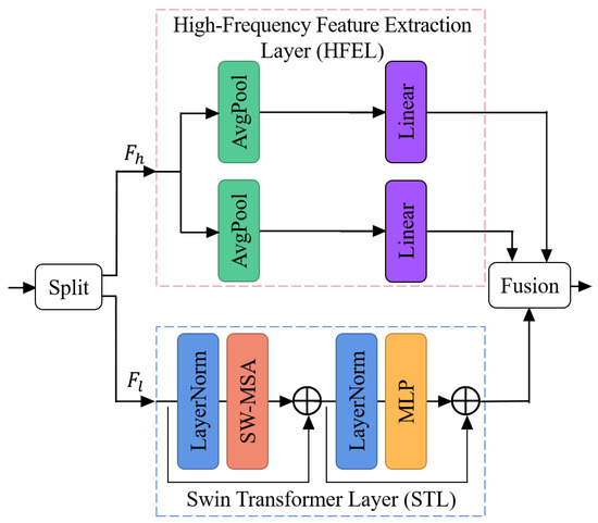 The internal structure of STAL is shown in Figure 2. Each STAL has two sections: the High-Frequency Feature Extraction Layer (HFEL), which consists of two parallel average pooling and fully connected layers, and the Swin Transformer Layer (STL) [8]. The use of channel separation strategies allows the network to independently process low- and high-frequency information in infrared images, mitigating interference during the learning of different structural features. This approach also reduces computational complexity and accelerates the convergence of the network.