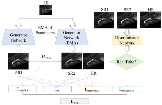 where and represent the adversarial losses of the generator network and discriminator network, respectively. and denote the probabilities the SR and HR images are trained to be classified as real images, respectively.