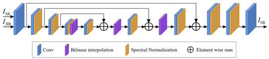 The discriminator network primarily comprises 10 convolutional layers, 8 spectral normalization layers, and 3 bilinear interpolation layers. Each of the first 9 convolutional layers is followed by a Leaky ReLU activation function. Table 1 provides the detailed information about each convolutional layer in the discriminator network.