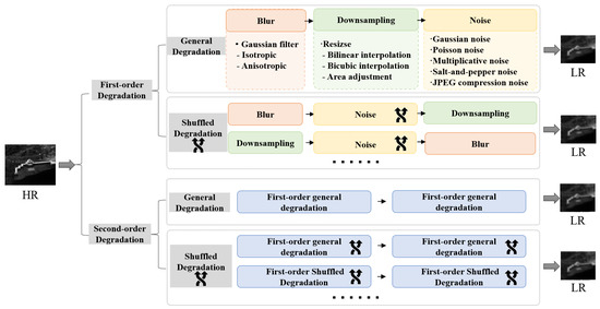 To expand the degradation space, we consider both first- and second-order degradations. For the first-order degenerate process, general and shuffled degradations are applied. The general degradation refers to the sequential application of blur, downsampling, and noise in sets of two or three. The shuffled degradation involves the random ordering of the degradation steps. For the second-order degenerate process, the same two degradation types are considered. The general degradation comprises two first-order degradation processes, while the shuffled degradation involves randomly shuffling blur, downsampling, and noise for each of the two first-order degradation processes.