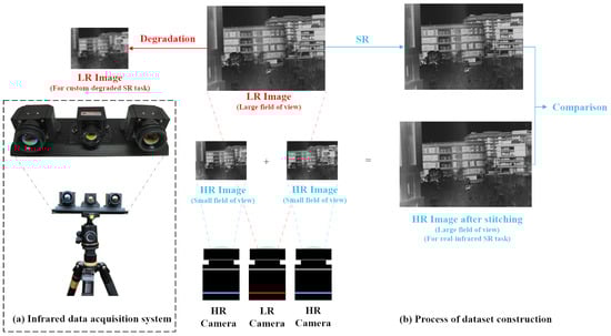 Traditional infrared image SR methods, similar to visible image SR methods, can be categorized into frequency domain-based, dictionary-based, and other methods. Frequency domain-based methods decompose the infrared image into the spatial domain and the frequency domain [17], processing the image separately in each domain. For example, Choi et al. [18] distinguished the edge pixels of infrared images and utilized visible images as guidance to enhance the high-frequency information of infrared images. Mao et al. [19] transformed the infrared image SR problem into a sparse signal reconstruction problem based on differential operations, significantly enhancing the algorithm’s speed. Dictionary-based methods [20,21,22,23,24,25] focus on constructing the mapping relationship between LR and HR image patches. By leveraging the relationships between image patches, these methods retain the pattern information of LR images in HR images. This type of method has garnered researchers’ attention for its interpretability. Other traditional methods include iterative methods [26,27], regularization methods [28], and so on.
