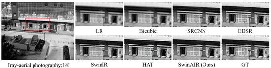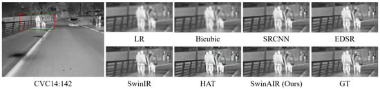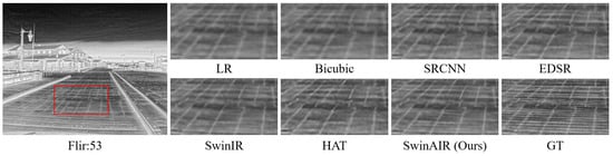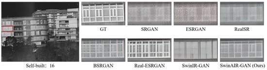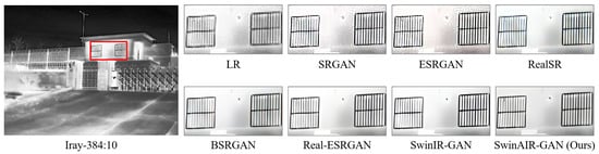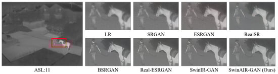 Visual comparison. We compare the visual reconstruction results of different methods for real infrared images on multiple datasets at the ×4 scale. Compared with other methods, our proposed SwinAIR-GAN is able to restore details and textures more accurately and achieve better visual effects closer to the real images. For example, in Figure 15, only SwinAIR-GAN restores texture details consistent with the real scene. Other methods either introduce a lot of noise (e.g., ESRGAN [41], RealSR [54]) or generate incorrect details and textures (e.g., Real-ESRGAN [14], BSRGAN [13]). In other scenarios, our method recovers texture details that are more visually accurate and consistent with the LR image (e.g., the restoration of window lines on the left side in Figure 16 and the restoration of the person’s arm in Figure 17).