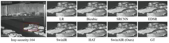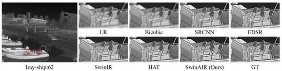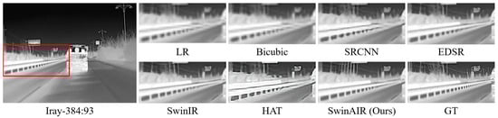 Visual comparison results achieved by different methods for real infrared images on the Iray-384 dataset [58] at the ×4 scale. LR represents the original image in the red box of the leftmost image.