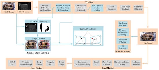 Framework of BY-SLAM. Two new threads have been added to the ORB-SLAM3 framework: dynamic object detection and dense 3D mapping. The ORB-SLAM3 framework is shown in gray; the new features added to BY-SLAM are shown in blue.