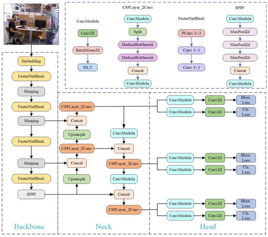 In the BY-SLAM system proposed in this paper, adding dynamic target detection threads increases the elapsed time. To ensure the real-time performance of the SLAM system, a lightweight YOLOv8s model is required. Table 1 demonstrates the performance comparison of the lightweight FasterNet [30], MobileViT [42], MobileNetV2 [43], and PVT [44] on different devices. The data in the table, cited from ref. [30], show the throughput and latency performance of these network models on GPU (NVIDIA 2080Ti, Santa Clara, CA, USA), CPU (Intel i9-9900X, Santa Clara, CA, USA), and ARM (ARM Cortex-A72, Cambridge, UK) devices as well as their parameter counts and accuracy. It can be seen that FasterNet runs optimally on different devices. Therefore, we chose to use FasterNet to replace the backbone of YOLOv8s, and the YOLOv8s-FasterNet structure is shown in Figure 3.