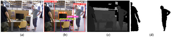 DBSCAN clustering experiment. (a) RGB image of the 90th frame of the fr3_walking_xyz sequence; (b) object detection results; (c) depth image of the 90th frame of the fr3_walking_xyz sequence; (d) DBSCAN clustering results.