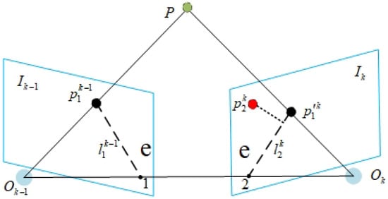 where is the skew-symmetric matrix of t. Equation (11) indicates that the static point P in the world coordinate system and its projections and on the camera planes and , respectively, must satisfy the epipolar line constraint. Combined with the fundamental matrix , then: