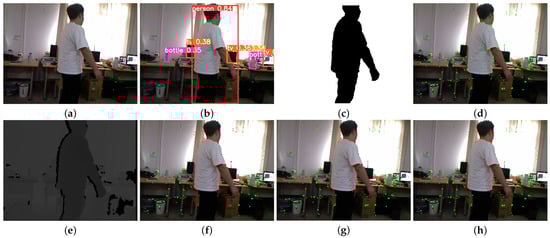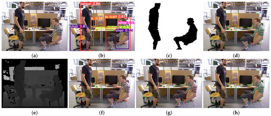 Dynamic feature point elimination experiment for the TUM RGB-D dataset. (a) RGB image of the 87th frame of the fr3_walking_static sequence; (b) object detection results; (c) clustering results of DBSCAN; (d) feature extraction results of ORB-SLAM3; (e) depth image of the 87th frame of the fr3_walking_static sequence; (f) direct rejection of all feature points in the target frame; (g) direct elimination of dynamic feature points within the semantic mask; (h) the result of eliminating dynamic feature points using our algorithm.