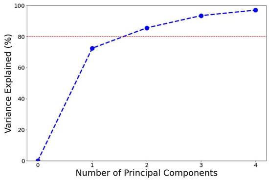 Cumulative proportion of variance explained by the number of dimensions. The red line indicates the 80% variance explained threshold.