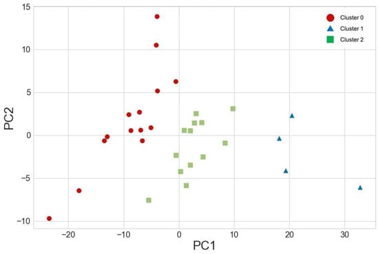 Cluster analysis results based on two principal components (PC1 and PC2) using Ward’s method [19].