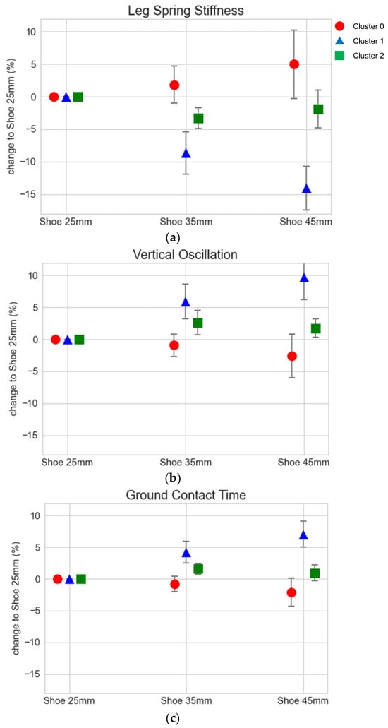 The average values and standard deviations of the recorded running parameters of each cluster are displayed in Figure 4 in descending order of variance contribution. The numeric values are listed in Table A1 in Appendix A. Cluster 0 showed a gradual increase in leg spring stiffness and a decrease in both vertical oscillation and ground contact time when running in shoes with increasing stack heights. The flight times were longer and the peak ground reaction force was higher for the participants in this cluster. Cluster 1 gradually decreased in leg spring stiffness but increasd in vertical oscillation and ground contact time using the shoes with 35 mm and 45 mm stack heights. In this group, the flight times and peak ground reaction forces were both reduced with higher stack heights. The leg spring stiffness of Cluster 2 decreased using the 35 mm shoe but increased 1.4% in the 45 mm shoe compared to the 35 mm shoe. The vertical oscillation and ground contact time both increased for cluster 2 and had their peak with the 35 mm shoe. Furthermore, the flight time was reduced with the 35 mm shoe but showed an increase with the 45 mm shoe. The peak ground reaction forces were reduced in both shoe conditions with a higher stack height by less than 1%.