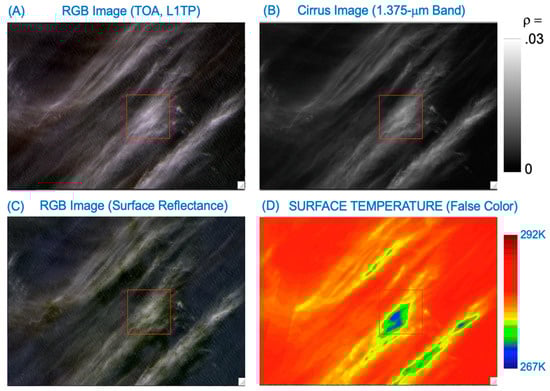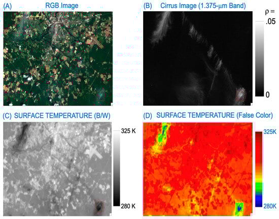 Figure 1 is an example for illustrating the thin cirrus effects on the Landsat 8 ST data products over land. Figure 1A is a portion of a true color image generated from the red, green, and blue band (RGB) data contained in a Landsat 8 L1TP data set, which was acquired on 1 July 2018, over the eastern coastal areas of Maryland State, USA. Figure 1B is the black/white (B/W) TOA cirrus band reflectance image (1.375-μm band), where black corresponds to zero reflectance and bright white to 0.05 reflectance. In general, the thin cirrus clouds seen clearly in the Figure 1B 1.375-μm band image are not easily identifiable in the Figure 1A RGB image. The thin cirrus-affected areas in the upper left portion of Figure 1A are faint, but clearly impact the ST product (Figure 1C). Cirrus-affected areas are generally cooler than the nearby clear land areas. In order to demonstrate more obviously the thin cirrus effects on Landsat 8 ST data products, we show in Figure 1D the ST image in false color. The ST values over cirrus-affected areas (deep blue color) are about 20 K lower than nearby clear areas (red color). By comparing Figure 1B with Figure 1D, it is seen that thin cirrus clouds can introduce errors of ~20 K into the Landsat 8 ST data products over land. Such cirrus-induced ST errors are much larger than the errors (about 1 K) introduced from all other sources (e.g., atmospheric profiles) during the operational generation of the Landsat ST data products at USGS.