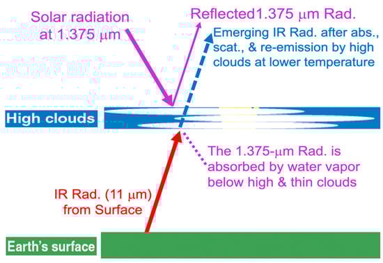 A diagram illustrating that the IR radiances originating from Earth’s surface are absorbed, scattered, and re-emitted at lower temperatures by cirrus clouds at high altitudes (approximately 10 km) and that the downward solar radiation at 1.375-μm is scattered backup by cirrus clouds and the transmitted 1.375-μm radiance through cirrus is absorbed by atmospheric water vapor beneath cirrus clouds.