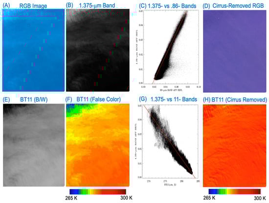 The procedures for removing cirrus scattering effects for a given solar band (B) using the correlations between this band and the 1.375-μm cirrus detection band have been previously described [24]. A total of five steps are involved: (a) converting the TOA measured radiances (L) of Band B into TOA apparent reflectances, ρ*(B), based on Equation (1); (b) making the scatter plot ρ*(1.375-μm) versus ρ*(B) (for illustrative purposes, see Figure 5C); (c) obtaining the slope, SB, from the scatter plot as illustrated in Figure 5C; (d) calculating the cirrus reflectance image, ρc(B), for Band B, which is equal to ρ*(1.375-μm)/SB; (e) subtracting out ρc(B) from ρ*(B) to obtain the cirrus-removed band B virtual surface reflectance image, ρs(B). As will be seen shortly, a slight variation of this technique is very effective for the removal of thin cirrus absorption effects in Landsat 8/9 OLI 11-μm band BT images.