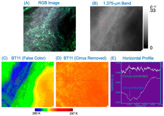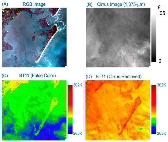 A portion of a Landsat 8 OLI RGB image acquired over a coastal area in the State of Maryland, USA, on 17 April 2014, is shown in Figure 6A. The scene contained solid land surfaces and muddy soil and sandy surfaces. The corresponding 1.375-μm band image is shown in Figure 6B, and the false-colored 11-μm band BT image in Figure 6C. The bottom half of the scene had slightly thick cirrus clouds (see Figure 6B) and therefore smaller BT values (see Figure 6C). Figure 6D is the 11-μm band BT image after the removal of cirrus absorption effects. By comparing Figure 6C with Figure 6D, it is seen that the solid land surface features, in particular the right half of the scene, are seen much better after cirrus corrections.