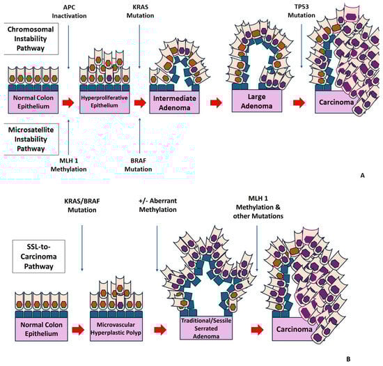 Sporadic CRC originates from the epithelial cells lining the colon or rectum and typically develops from non-cancerous precursor lesions, which grow gradually for 10–20 years before sustaining malignant transformation and progressing to invasive carcinomas [19,20,21,22,23]. CRC evolves from cancer stem cells (CSCs), residing in the base of colonic crypts. CSCs following a Darwinian pattern accumulate successive genetic and epigenetic aberrations that inactivate tumor-suppressor genes and activate proto-oncogenes, subsequently conferring selective advantages in terms of cellular survival, proliferation, progression, metastasis, and therapy resistance [24,25,26,27,28]. CRC is a stepwise progression of premalignant lesions; approximately 70% of sporadic CRCs are initiated from adenomatous polyps via the adenoma–carcinoma sequence (Figure 2A), governed by mutation of the tumor-suppressor APC (adenomatous polyposis coli), followed by the acquisition of mutations in proto-oncogene KRAS (Kirsten rat sarcoma virus) and the tumor-suppressor P53 (tumor protein P53; transformation-related protein 53; TRP53), chromosomal, and microsatellite instability (MSI), in increasing adenomas and invasive adenocarcinomas. The remaining 25–30% of CRC arise from sessile serrated lesions (SSLs) through the SSL-to-carcinoma pathways (Figure 2B), associated with mutations in the proto-oncogene BRAF (v-raf murine sarcoma viral oncogene homolog B), MSI, and gene promoter hypermethylation (CpG island methylator phenotype) [7,19,28,29]. Thus, most CRCs are amenable to prevention strategies, offering a window of opportunity to be identified as a precursor, nonmalignant lesions, or in the earliest and highly curable stage.