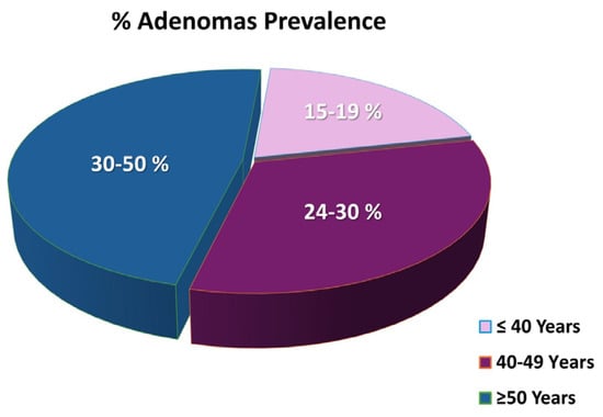 The advent of high-definition endoscopes, which can detect 1–2 mm lesions, has revealed that adenomas are extremely common in the general population; the prevalence reaches 15–19%, 24–30%, and 30–50% in individuals ≤40 years, 40–49 years, and ≥50 years, respectively [30] (Figure 3). Less than 5–10% of all adenomas harbor malignant potential, and their size, histological type, architectural growth, and dysplastic grade are predictive of their evolution to CRC. The risk of cancerous transformation is 1–3%, 10%, and >40% for adenomatous polyps <1 cm, 1–2 cm, and >2 cm, respectively [19]. In high-grade dysplasia, the risk of invasive carcinoma is 27% [19,31,32].