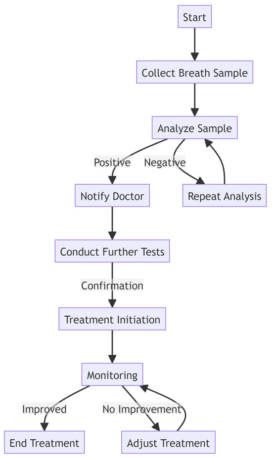 Flowchart of the process from collecting the sample to treatment. By using a POC biosensor to analyze samples and detect VOCs in patients’ breath samples, the process becomes quicker, resulting in faster treatment for the patients.