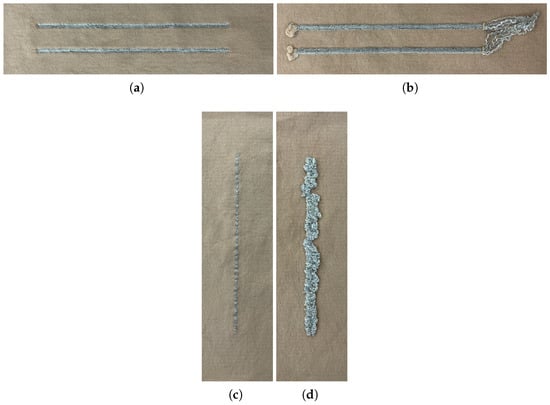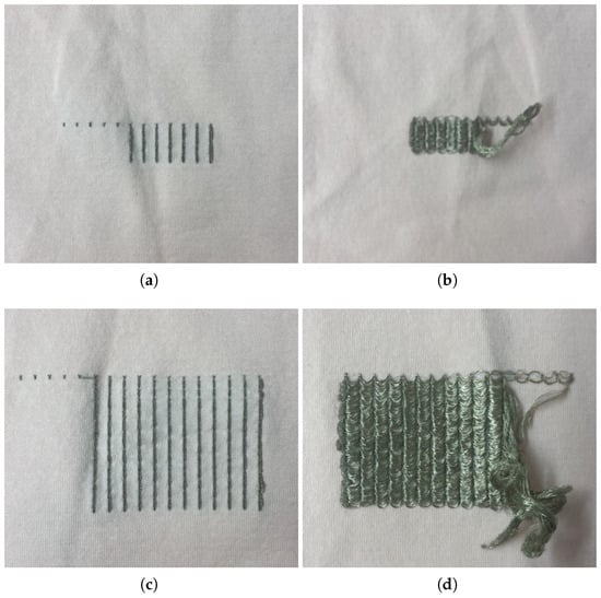 Figure 2 presents the designed samples. It can be observed that on the inner side of the vertical tracks (Figure 2d), a surplus of fiber is evident due to the constant switching between the conductive fiber and the base textile fiber. This fiber excess corresponds to the cuts made in the conductive fiber to switch to the base textile fiber. Similarly, to assess the effect of the thickness of the conductive track on its electrical properties, tracks were designed with two different thicknesses of six and eight courses, which translate into widths of approximately 1.9 mm and 2.5 mm, respectively.