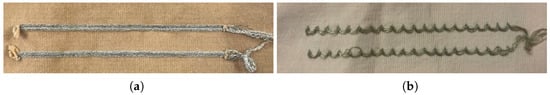 Besides the thickness and orientation of the conductive tracks, samples with two different knitted structures were also designed, as presented in Figure 3. In one of them, the base textile courses were completely replaced by conductive fibers so that the tracks were fully integrated into the textile fabric of the sample (Figure 3a). The other tested structure consists of the formation of floating loops, meaning that the conductive fiber is knitted only at specific points of the base textile knit, causing loops of conductive fiber to be formed in the interior portion of the sample, connecting the knitted points (Figure 3b). This structure has the advantage of reducing the amount of conductive fiber required, making it possible to reduce costs.