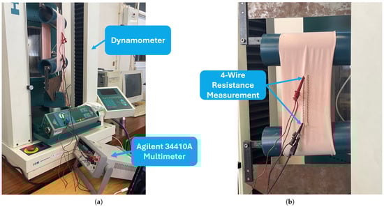Tensile strength tests were conducted on the samples using a dynamometer for which the setup allowed controlled extension of the sample in terms of a maximum value, number of cycles, and constant speed. During the extension tests, the sample resistance was measured using an Agilent 34410A digital multimeter [34] with a four-wire configuration. This configuration ensures accurate resistance measurement by connecting the current and voltage sources to the same point on the sample, mitigating contact resistance between the probes and the sample. The testing setup is illustrated in Figure 5.