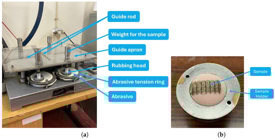 Abrasion tests were carried out to evaluate the durability of the metallic coating on the conductive fibers when exposed to repeated abrasion cycles. The Martindale abrasion tester (Figure 6a) was used for this purpose. The test sample was placed inside the rubbing head (Figure 6b), in contact with the surface of the abrasive, with a weight placed on top of it, allowing the sample to be pressed lightly onto the surface of the abrasive during a cyclic and complex pattern of Lissajous figures [35]. The weight placed on the samples had a mass of 595 g, and the abrasive used was worsted wool.