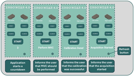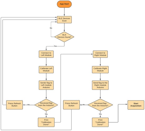To facilitate control and communication with the signal acquisition modules, an Android application was developed that communicates with the Arduino using the BLE communication protocol. Figure 9 presents the developed application, while Figure 10 depicts the flowchart of the application. The application allows the user to connect to the acquisition modules, start their calibration sequence, and begin signal acquisition. The application starts by searching for available BLE devices in the surrounding area. If the acquisition modules are found, the user can start the connection process with the left module. When the connection is established, the left module can be calibrated by pressing the “Calibrate” button. A countdown starts, and at the end of it, a flag is sent to the Arduino of the acquisition circuit to start the calibration sequence. Once the left module has been calibrated, the user can repeat the process for the right module. After calibration of both modules, signal acquisition can be started by pressing the “Start” button. When this button is pressed, a flag is sent to the Arduino to start acquiring the signal.