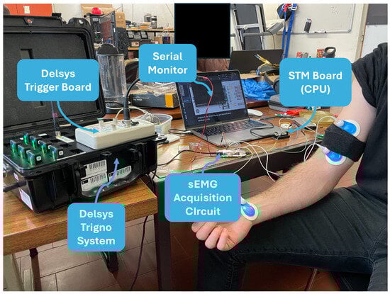 The data from the sEMG acquisition board were displayed on a serial monitor for real-time analysis. Although the sEMG circuit can be powered by a LiPo battery, during the validation experiments, the sEMG circuit was powered via the Arduino Nano 33 IoT, which, in turn, was powered via USB from the computer. The complete test setup is depicted in Figure 12.