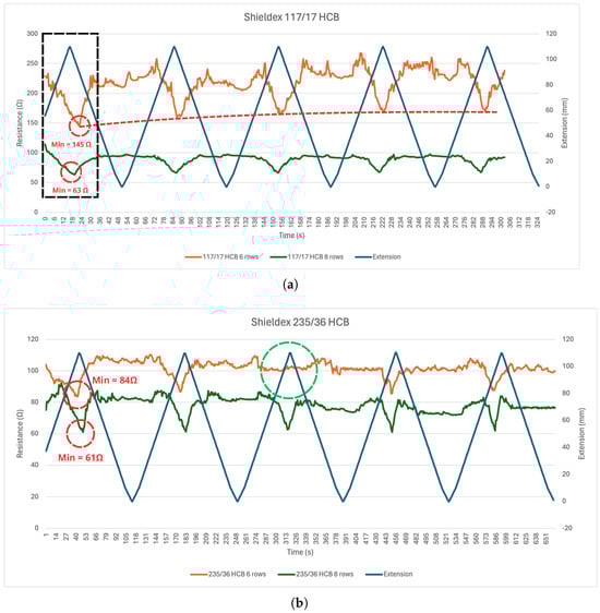 Tensile strength testing on Shieldex samples yielded interesting insights about their mechanical performance. At maximum extension, the resistance of the Shieldex 117/17 HCB samples with a thickness of six rows decreased to 145 , with the minimum resistance value exhibiting discernible variations throughout the traction cycles. The eight-row-thick samples reached a minimum resistance value of 63 , also showing a slight increase in the minimum resistance value throughout the test cycles (Figure 16a). In the samples produced with 235/36 HCB fiber, the minimum values reached were 84 for the six-row-thick sample and 61 for the eight-row-thick sample (Figure 16b). A marginal increase in the minimum resistance value reached at each traction cycle is also measured, but it was to a lesser degree compared with the 117/17 HCB fiber, which can be explained by the higher tenacity of the 235/36 HCB fiber (60 cN/tex compared to 48 cN/tex for the 117/17 HCB fiber), making it more capable of returning to its original form between traction cycles.