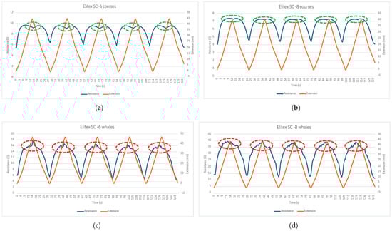 In contrast to the Shieldex samples, the Elitex SC fiber samples showed more consistent resistance values during tensile strength tests. With traction, the resistance increased gradually, peaking at 9.5 for the six-row tracks (Figure 17a) and 7.4 for the eight-row tracks (Figure 17b). This suggests that Elitex SC fibers may provide better resistance to mechanical stress compared to Shieldex fibers. In the tests carried out on the samples with horizontal tracks, it can be seen that for traction close to the maximum traction tested (until the initial length increased by 30%), the variation in electrical resistance is significantly lower, which indicates that for the development of a future prototype, it would be appropriate to apply a pre-tension to these structures so that their electrical behavior remains in this range. In the vertical track samples, at extensions close to the maximum extension tested, the behavior is more oscillatory, which may be due to the reorganization of the excess fiber resulting from the production process of these structures. It was also possible to see that for the three types of fiber used, the resistance values (both at rest and during traction) are lower in the eight-row samples than in the six-row samples. In the eight-row-thick samples, there is a higher concentration of knitted conductive fibers, which reduces the electrical resistance and increases the conductivity. Furthermore, analysis of the tensile tests revealed that in structures knitted with floating loops (as seen in Shieldex samples), resistance decreases as tensile strength increases. This decrease in resistance can be explained by the better alignment of the fibers in the loops, which increases conductivity. Conversely, in structures where base textile courses are entirely replaced by conductive fiber (as observed in the Elitex samples), resistance increases with traction.