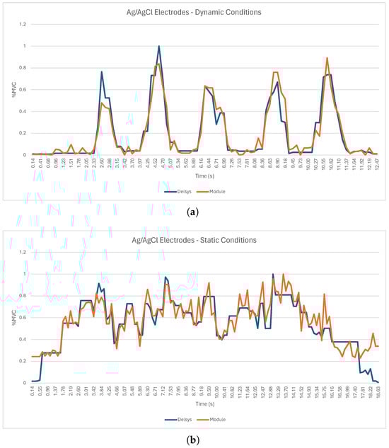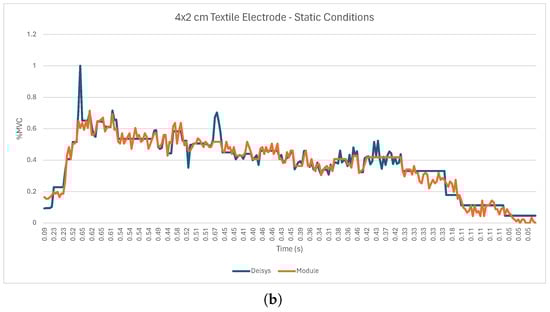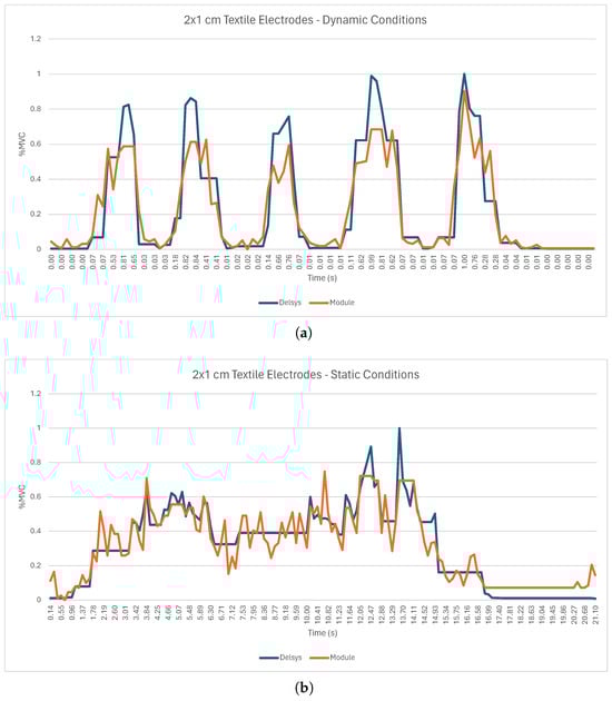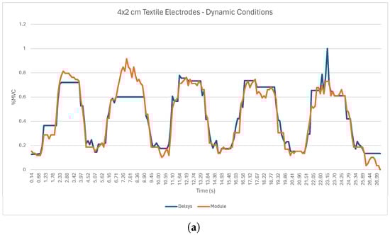 The tensile test results revealed that samples made with Elitex SC fibers exhibit more stable variations in resistance values. In the samples produced with Shieldex fibers (117/17 HCB and 235/36 HCB), the variations show a more oscillatory behavior. In the abrasion tests, similarly to the tensile strength tests carried out, the samples produced with Elitex SC fibers showed significantly less pronounced variations in resistance values compared to the samples produced with Shieldex fibers, with resistance values remaining below 4.0 after 3000 abrasion cycles. Regarding the acquisition capabilities of textile surface electrodes, it was found that for a larger surface area (4 × 2 cm), the acquired signal is closer to the reference signal from the commercial Delsys system and has a lower RMSE compared to 2 × 1 cm surface electrodes in both static and dynamic conditions. In comparative terms, the performance of the 4 × 2 cm textile electrodes was similar to that of the Ag/AgCl electrodes.