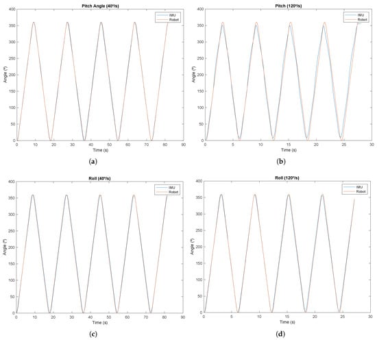 Angle estimation tests: (a) Pitch angles at 40°/s. (b) Pitch angles at 120°/s. (c) Roll angles at 40°/s (d) Roll angles at 120°/s.