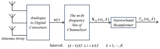 Consider an aperture array made of N antenna elements, the array output vector at time t is . The total observation interval T is divided into K disjoint intervals of length and indexed with k. Channelizer converts the divided input vector from time domain to frequency domain, to generate a set of complex vectors. The complex vector is referred as frequency-domain snapshot, which is an N-dimensional vector corresponding to the Fourier series coefficient at , where is the centre frequency of the m th frequency bin.
