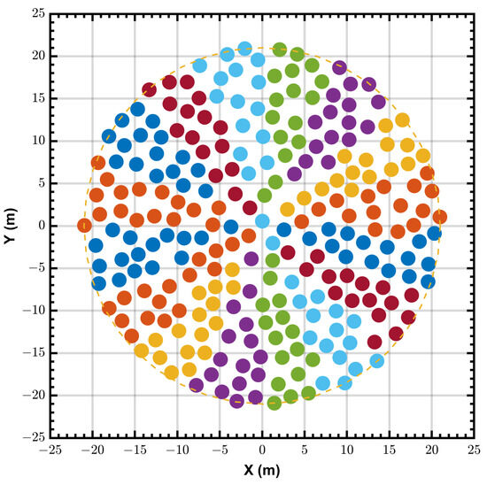 Figure 2 shows an example of a quasi-random configuration for a 42 m station with 256 antennas, the antennas are divided into 16 tiles (denoted in different colors). The average spacing between elements is 2.1142 m, with a minimum spacing of 2 m, whilst most are concentrated between 2 m and 2.3 m. The simulation results in this paper are based on this configuration. This configuration may differ from the actual final configuration, but the relevant conclusions in this article are not affected.