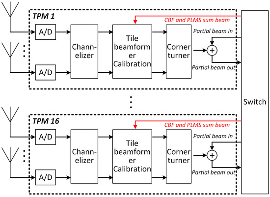 To apply the proposed PLMS adaptive beamforming strategy on SKA-low station, we simply add one additional data loop to each TPM, as shown in red lines in Figure 3. Each additional data loop is used to transfer two sum beam data-classical beam and adaptive beam, at a data rate of 124 Mbps per frequency bin. One GTH transceiver on the FPGA has a bandwidth up to 13 Gbps, which can support about 100 frequency bins of loop data. Since RFI exists in only few fequency bins, one additional GTH transceiver is considered sufficient to enable the adaptive beamforming strategy. In addition, the PLMS adaptive beamformer outputs both classical and adaptive beams, allowing free selection of desired output.