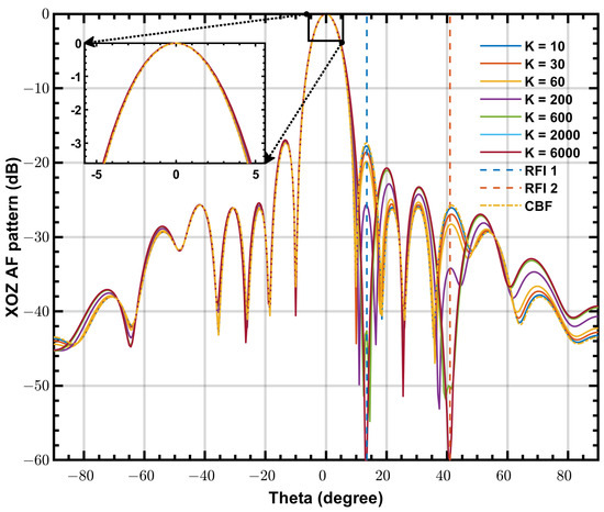 In Figure 5, representative beam patterns of PLMS beamformer and CBF for various K are plotted. There are two striking features: (1) The PLMS beam pattern is changed iteratively from the CBF beam pattern as a starting point, meaning a same performance as the CBF when no interference is present. (2) Throughout the iterations, the beam pattern maintains a main lobe nearly identical to that of CBF, meaning that the array response to the observing space region is stable, which is of most interest to astronomers. These features make the PLMS beamforming strategy suitable for SKA-low aperture array.