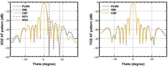 The beam patterns calculated from the final output weighting coefficients when two RFIs are incident at and , respectively.