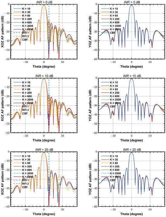 Figure 4 shows the simulated beam patterns of the station with = 20 dB, K = 10,000 and at 50 MHz, 200 MHz and 350 MHz, respectively. The left part shows the top view of the 3D beam pattern versus and (defined in sine space: ) on a logarithmic scale, and the right part shows the beam pattern cut on XOZ plane in ()-space (spherical coordinate system). As one can see, all the beam patterns have deep nulls (lower than −60 dB) at the directions of two interferer.