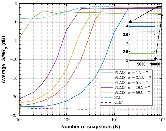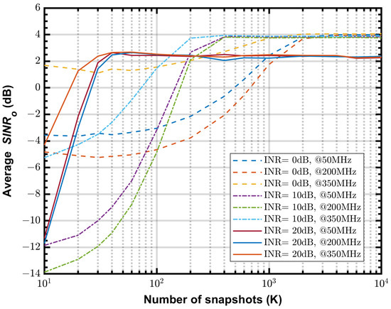 Figure 10 shows the simulated vs. K at 50 MHz for INR = 20 dB, with different and . As can be seen from the figure, decreasing the step size improves the final of PLMS beamformer, and it almost reaches the optimal performance when . However, smaller step size reduces the convergence speed, so there is a trade-off to be made here. According to (26), we can obtain an estimate of based on the actual snapshots. In the simulation shown in Figure 10, when and , the step size , then the final average = 3.87 dB, which differs from the optimal value by only 0.15 dB. However, the number of snapshots required for convergence is reduced to 600 in this configuration. In contrast, the number of required snapshots is 2000 when , with a final average = 3.95 dB.