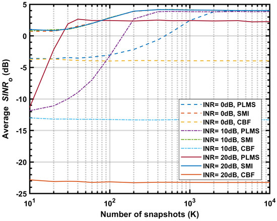 Figure 9 shows the simulated vs. K at 50 MHz for different beamformers, with input INR = 0, 10 and 20 dB, . The average of CBF gives a initial and iteration start point for PLMS beamformer. SMI beamformer has a optimal performance that less affected by input , which provides a limit value reference for PLMS performance optimization. As one can see, the average of PLMS for INR = 20 dB doesn’t reach the optimal value, and the number of snapshots required for convergence is surprisingly less than SMI. It is reasonable to suspect that the iterative approximation is not optimal.