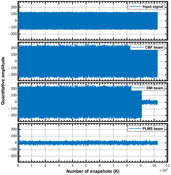 The PLMS beamformer is a real-time processor, whose weight coefficients are updated with each snapshot. In contrast, the SMI beamformer is a block processor, whose operations such as solving average covariance matrix, Cholesky decomposition, and matrix multiplication take many clock cycles, and thus the DSP48s can be time-multiplexed; this is the reason why the SMI beamformer uses less DSP48s resources than the PLMS beamformer. The different real-time performance of PLMS and SMI can be easily demonstrated by experiment, as shown in Figure 11. Where SMI weighting coefficients are updated after more than 9000 snapshots, while PLMS weighting coefficients are updated in real time and converge within 100 snapshots. Since FPGA is real-time processor, its processing speed depends on the clock frequency and the amount of parallelism. Assuming a FPGA running at a clock frequency of 100 MHz (which is usually higher in practice) and quad-parallelism. The SMI beamformer requires about 2250 clock cycles to update the weighting coefficients once, or , while the PLMS beamformer is updated once per clock cycle, or . In comparison, the real-time beamformer using GPU takes ms order of time to complete one weight coefficient update [35]. The FPGA-based beamformer has an advantage in terms of real-time performance.